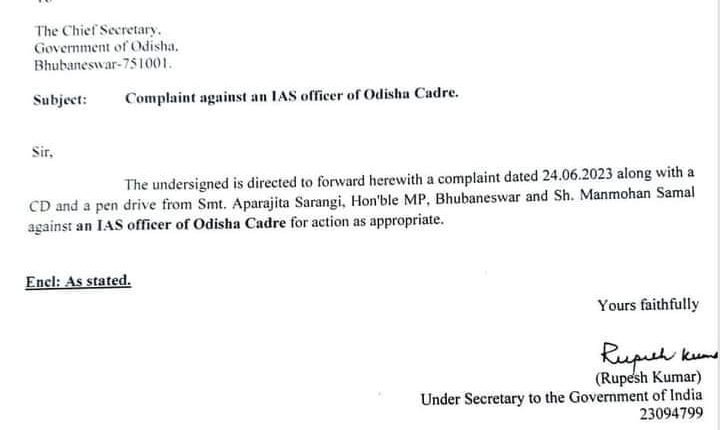 କେନ୍ଦ୍ରର ଚିଠିକୁ ସାଂସଦ ଅପରାଜିତା ଷଡ଼ଙ୍ଗୀ ମଙ୍ଗଳବାର ନିଜ ଟ୍ୱିଟ୍ ମାଧ୍ୟମରେ ସାର୍ବଜନୀନ କରିଛନ୍ତି। ଏଥିରେ ସେ କହିଛନ୍ତି ଯେ, ଓଡ଼ିଶା କ୍ୟାଡ଼ରର ଜଣେ ଅଫିସରଙ୍କ ଦ୍ୱାରା ଅଲଇଣ୍ଡିଆ ସର୍ଭିସ ରୁଲସର ଖୋଲା ଉଲ୍ଲଘଂନକୁ ଭାରତ ସରକାର ଗୁରୁତ୍ୱର ସହ ନେଇଛନ୍ତି। ରାଜ୍ୟ ସରକାର ଆଇଏଏସଙ୍କ କ୍ୟାଡ଼ର କଣ୍ଟ୍ରୋଲିଂ ଅଥରିଟି ହୋଇଥିବାରୁ ଉଲ୍ଲଘଂନର ସ୍ପଷ୍ଟ ତଥ୍ୟପ୍ରମାଣ ମିଳିବା ଆଧାରରେ ଏ ଦିଗରେ ଆବଶ୍ୟକ କାର୍ଯ୍ୟାନୁଷ୍ଠାନ ନେବାକୁ ମୁଖ୍ୟ ସଚିବଙ୍କୁ କୁହାଯାଇଛି। ଆମେ ଆଶା କରୁଛୁ ଆଇନ ତା ବାଟରେ ଯିବ।
